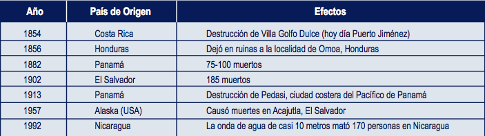 Before September 1992, Central America underestimated tsunami-related hazards, until a wave almost 10 meters high hit the Pacific Coast of Nicaragua, inundating vast stretches of land and killing 170 people. The tsunami was preceded by a slow seism only slightly perceptible to the local population, which did not realize it was in danger and was caught unaware by the destructive event. It was after this that people started studying this hazard in the region and discovered that since 1539, 49 tsunamis have hit the shores of Central America, 37 in the Pacific and 12 in the Caribbean. They have taken a toll of nearly 500 lives in the region. Local sources produce tsunamis, but they are not the only reason. Earthquakes in Alaska and Colombia have also generated tsunamis that have traveled all the way to Central America, leaving destruction and death in their wake. The following table lists the most destructive tsunamis on record in Central America.